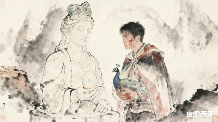 待光芒散尽,只见孔宣化作石像,掌心托着枚孔雀蛋。